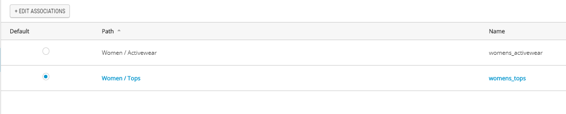 The Category Associations tab displays the associations to category created for this product: Path, Name, Display Name.