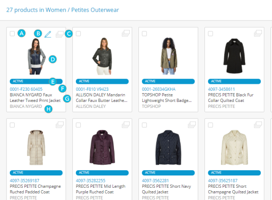 Products are displayed as tiles by default. You can switch to the list view which displays different information