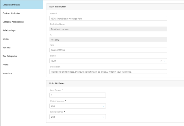 • | Main Information Displays the Product Name, Definition Name, ID, SKU, Brand, and Description. |