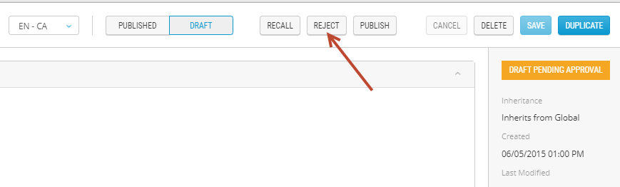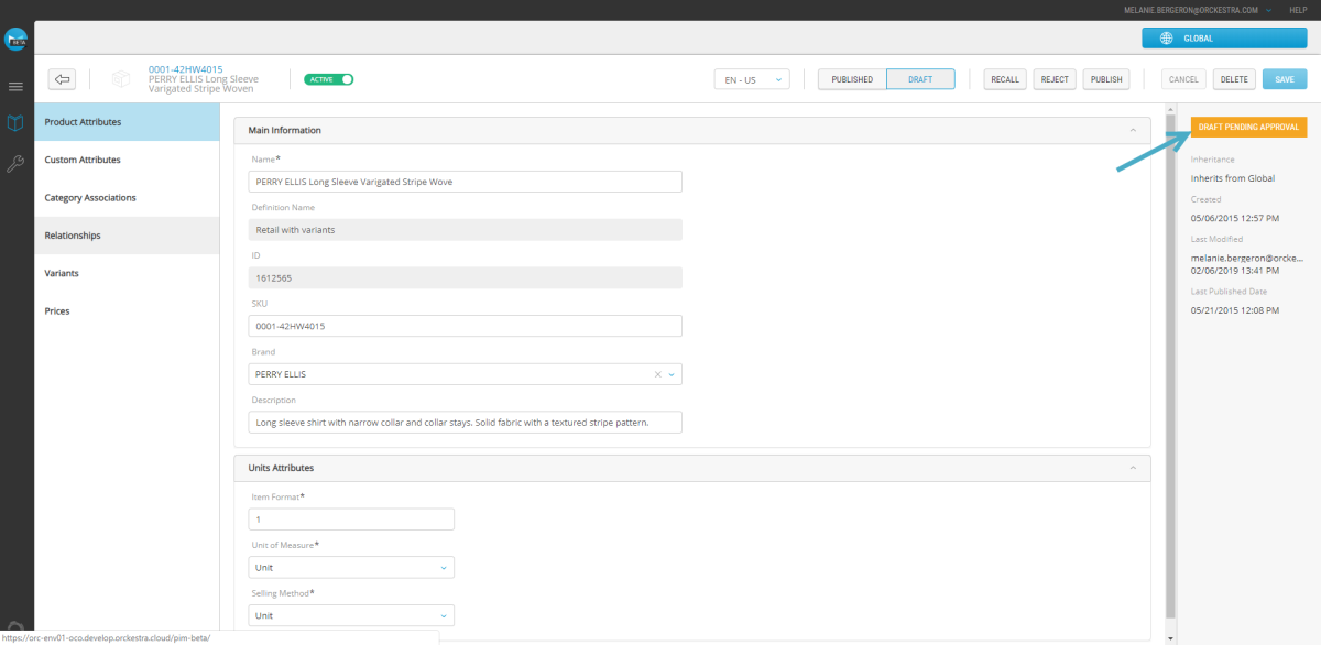 When products are sent for approval, as a product publisher, you can either publish or reject products that have been modified or created.