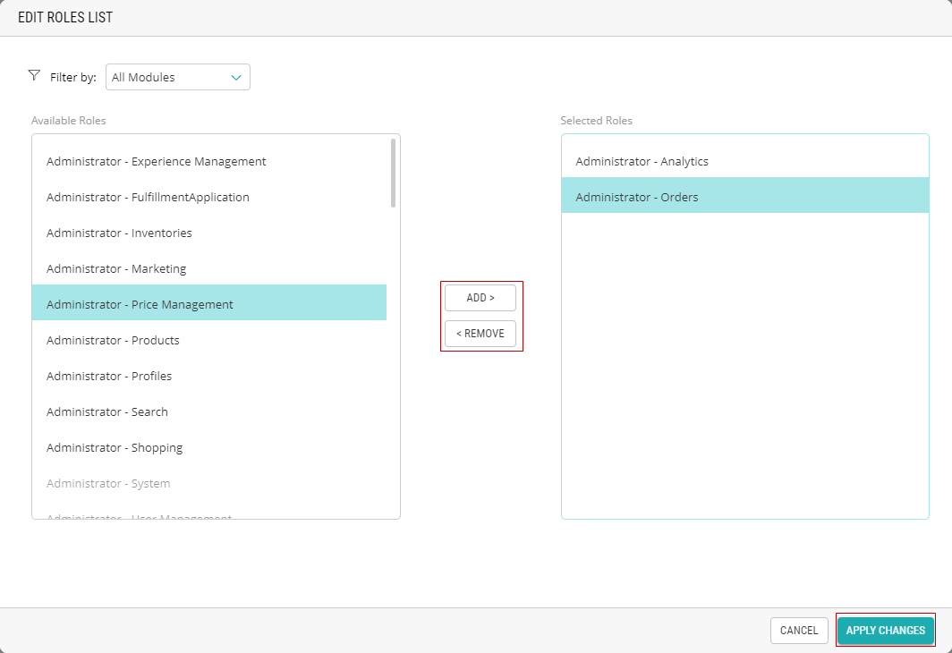 After you've made your modifications select Apply Changes in the bottom right of the window and then Save at the top-right of the exterior tab. The new role will be available under the Direct Roles list when managing the user's role.