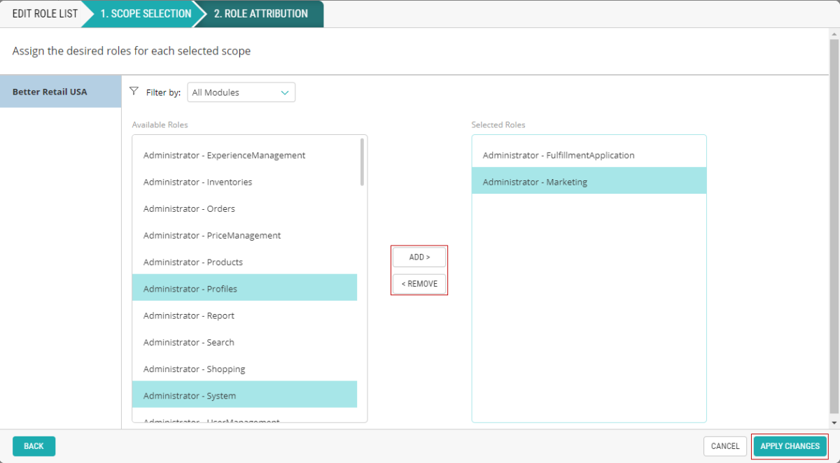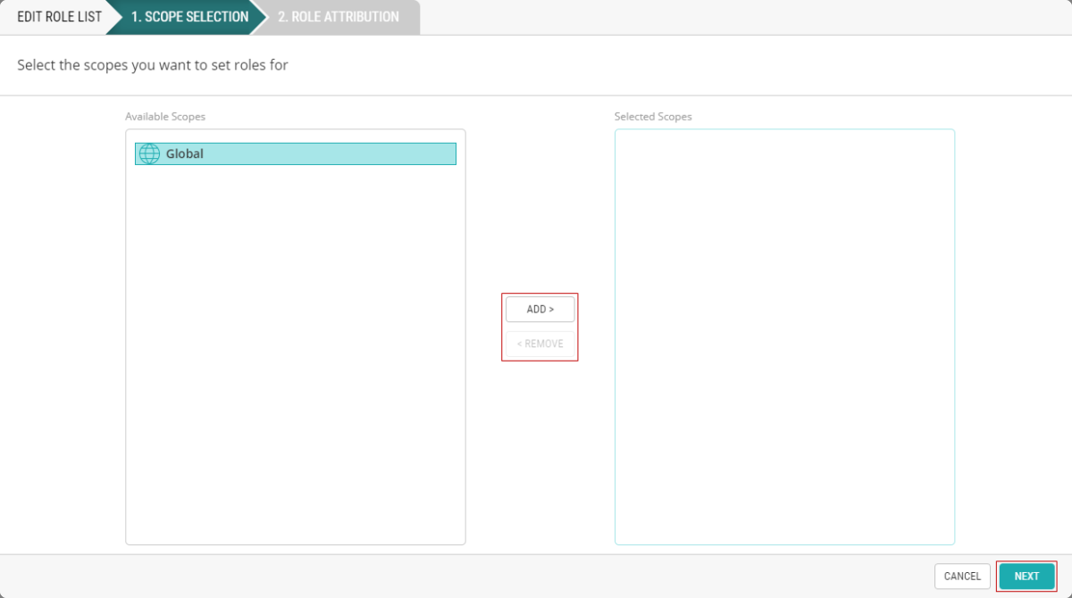 3. | On the edit role list page, select the scope for the role you want to modify and click Add or Remove in the middle of the page, then click Next at the bottom-right. |